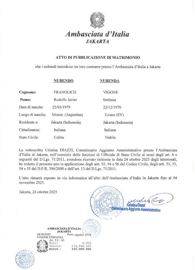 Pubblicazione di matrimonio tra il Signor FRANOLICH Rodolfo Javier e  la Signora VIGONE Stefania.